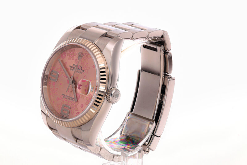 Die Rolex Datejust Ref. 116234 mit dem seltenen Floral Pink Zifferblatt vereint klassische Rolex-Eleganz mit einer außergewöhnlichen, femininen Note. Das fein strukturierte Zifferblatt mit floralem Motiv macht dieses Modell zu einer besonders gefragten Variante innerhalb der Datejust-Reihe.