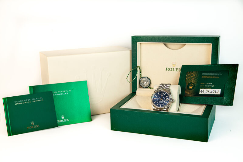 Die Rolex Sky-Dweller mit blauem Zifferblatt zählt zu den begehrtesten Modellen innerhalb der Rolex Kollektion. Sie kombiniert elegante Linienführung mit herausragender Funktionalität und bietet eine seltene Verbindung aus Luxus und technischer Präzision. Das ausdrucksstarke blaue Zifferblatt, die geriffelte Lünette und das robuste Edelstahlgehäuse verleihen der Uhr eine markante Präsenz. Ausgestattet mit zweiter Zeitzone und Jahreskalender ist die Sky-Dweller die ideale Wahl für Vielreisende und anspruchsvolle Uhrenträger. Das automatische Manufakturwerk sorgt für höchste Zuverlässigkeit im täglichen Gebrauch. Mit ihrem hochwertigen Jubilé-Armband bietet diese Uhr einen perfekten Sitz und eine zeitlose Optik.